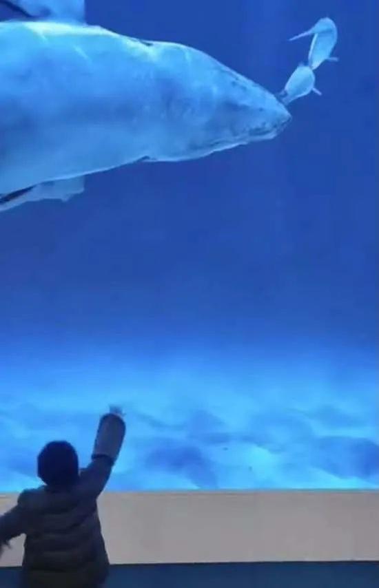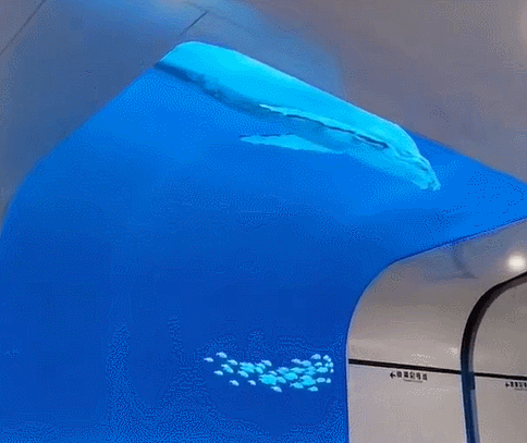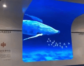 大屏幕之上,藍鯨??、魚群、藍色海洋,