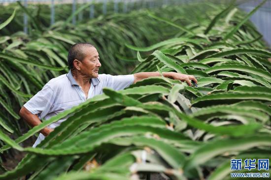 6月17日,河南省焦作市溫縣果香樂專業種植合作社,一位農民在管護火龍果。