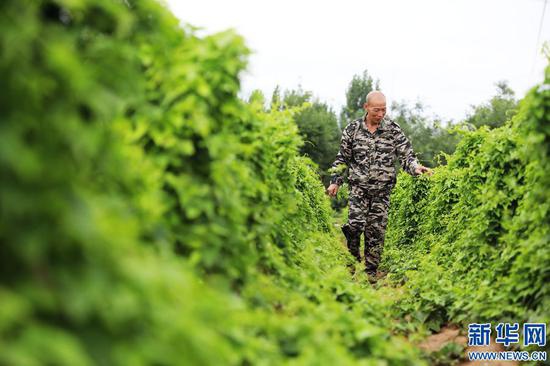 6月17日,河南省焦作市溫縣番田鎮劉馬莊村,一位農民在鐵棍山藥種植基地巡察。