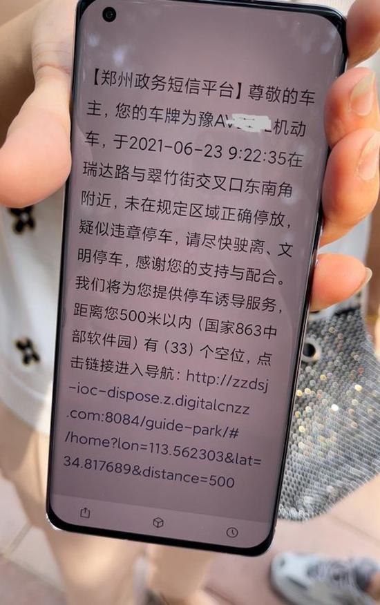 高新區(qū)智慧城市試驗(yàn)場工作人員高峰告訴記者,如果市民在附近禁停區(qū)域停車超過2分鐘,系統(tǒng)還會自動向車主發(fā)送違停提醒短信,“尊敬的車主,您的車牌為豫 AXXXXX 機(jī)動車,車輛在翠竹街與瑞達(dá)路交叉口西口附近,未在規(guī)定區(qū)域正確停放,疑似違章停車,請盡快駛離。距離您 500 米以內(nèi)有(10)個空位,點(diǎn)擊鏈接進(jìn)入導(dǎo)航 ……”