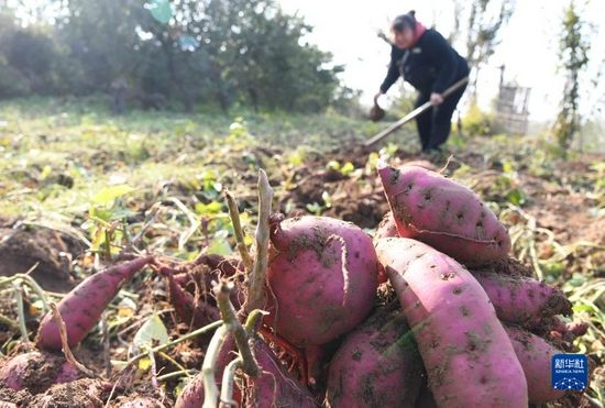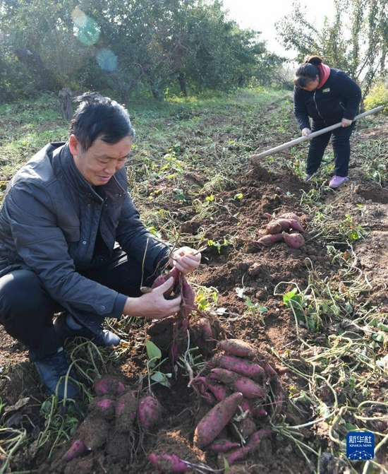 10月24日,濟源市邵原鎮史家腰村農民在田間采收富硒紅薯。新華社發(苗秋鬧攝)