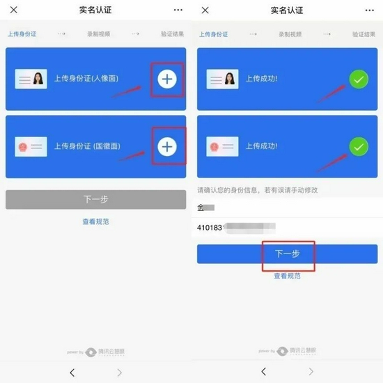 第三步:根據提示拍攝身份證正反面照片,并上傳。上傳成功后,點擊下一步;