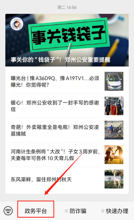 第一步:關注鄭州警民通公眾號,點擊菜單欄的“政務平臺”;