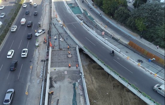 與此同時,黃河路立交西向南匝道以及集散車道南段的鋼箱梁也完成了架設和焊接,正在緊張的施工防撞墻和橋面鋪裝(圖四),預計11月下旬完成改造通車。