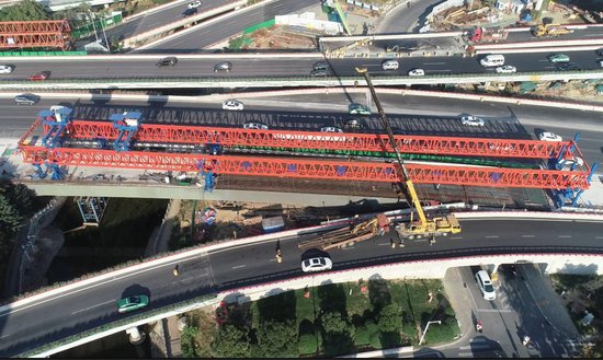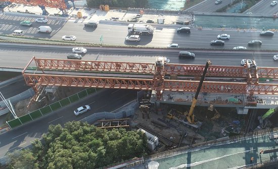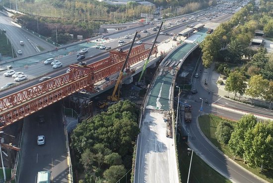鄭州中州大道金水立交改造有新進展。11月2日,隨著西側主線架橋機完成最后一跨鋼混疊合梁的架設(圖一),中州大道金水立交西側主線實現貫通。目前,東側主線架橋機已過孔第二跨至金水路中分帶(圖二),完成第二跨鋼箱梁的架設,正在焊接中,剩余跨越金水路和熊兒河的兩跨鋼箱梁預計本月中旬完成架設。按照計劃,本月下旬,金水立交東西主線拼寬橋將在完成防撞墻和瀝青鋪裝施工后通車。