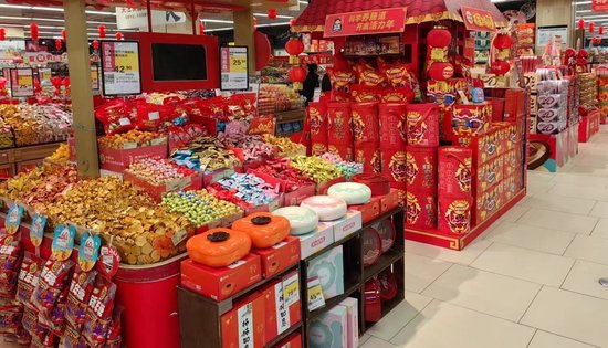 在河南省鄭州市金水區、中原區、鄭東新區等多家連鎖商超,記者見到貨架上擺滿了包裝喜慶、花樣豐富的各式年貨,部分超市將“年貨節”的紅色宣傳條幅懸掛在醒目位置。