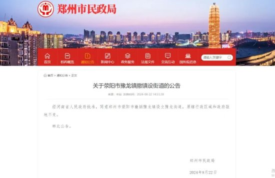 近日,鄭州市民政局發布公告:經河南省人民政府批準,同意鄭州市滎陽市撤銷豫龍鎮設立豫龍街道,原轄行政區域和政府駐地不變。