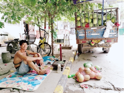 “老張中暑了,跑到社區(qū)診所看病涼快去了,就剩我還在這兒盯著賣西瓜。”她說老公經(jīng)不起折騰生了病,自己爬樓送瓜仍有不少力量。現(xiàn)在他們不擔心被人趕來趕去,賣瓜的同時開始自覺注意收拾起被人丟下的瓜皮。