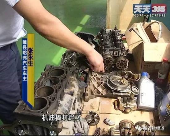 張先生:這就是我的發動機,汽缸套打爛了,活塞連桿打爛了,機油幫打爛了,那天非常危險,突然抱死。你看曲軸,明顯磨損痕跡,只有這一道軸磨損非常嚴重,說明早上的啪啪聲是由這個地方造成,連桿螺絲松動、斷裂,產生啪啪聲,上高速后轉速高,脫落了。連桿脫落以后,把機體打爛了。