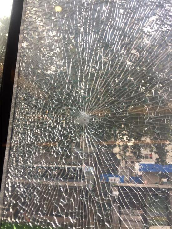 據悉,2號臺北側安裝的一塊高約4米、寬約1米的玻璃遭遇襲擊,玻璃下方出現一個孔洞,裂痕自孔洞向四周延伸開來,隨后店家查找店外路面找到了一粒鋼珠。
