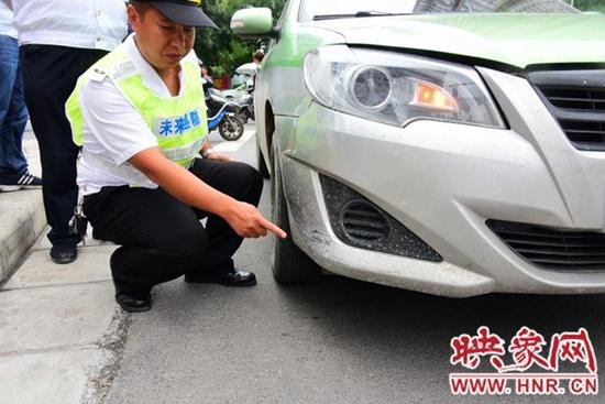 檢查發現,出租車右前車輪前的保險桿上有幾道清晰的刮蹭痕跡,但出租車司機否認是今天留下的。