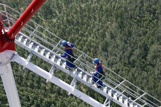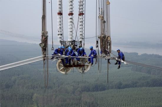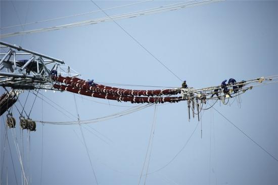 早上7點,施工負責人李小海帶領10名高空作業人員開始爬塔,連續作業直到下午5點,連午飯都是坐在到導線上吃的。經過在導線上10個小時的艱苦奮戰,他們才完成了一相導線的卡線作業。