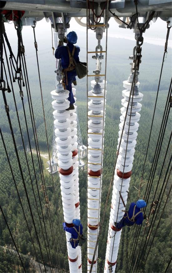 9月2日施工人員開始進行卡線作業。由于金具的體積大、重量大,每相導線的瓷瓶長度達到25米,相當于8層樓高,作業時施工人員需要從鐵塔頂端,通過瓷瓶旁邊的施工軟梯下到導線上。