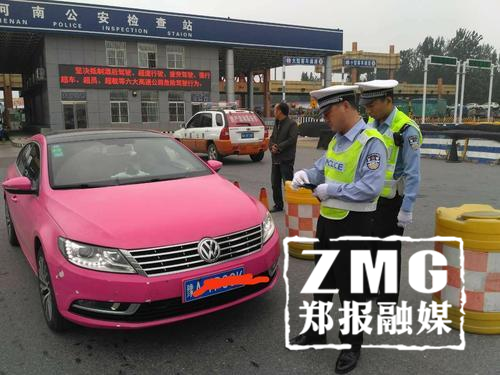 當日17時許,在G4京港澳高速豫冀界公安檢查站,河南省高速交警總隊四支隊民警易瑾帶領輔警王建偉、盧巖恒執勤時,看到一輛大眾CC車型的豫A7P8**的小轎車駛入收費廣場,車身呈粉色十分搶眼,引起了民警的注意,民警立即上前進行核實,果然,駕駛員出示行車證上顯示出廠車身顏色為白色,而行駛證上也沒有變更登記的事項。