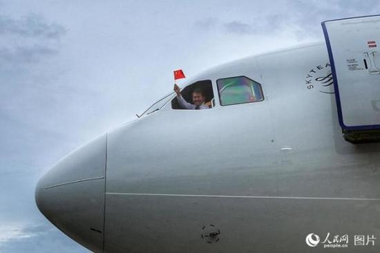 東航包機抵達安提瓜和巴布達的維爾·伯德機場,機組人員揮舞著國旗,歡迎同胞回家。人民網 王初 攝兩架包機飛越19個國家
