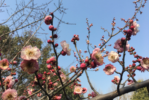 另外,美人梅是園藝雜交種,由重瓣粉型梅花與紅葉李雜交而成,花粉紅色,花朵繁密,先花后葉,自然花期自3月第一朵花開(kāi)以后,逐次自上而下陸續(xù)開(kāi)放至4月中旬,是我園最后盛開(kāi)的梅花品種。