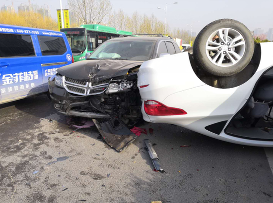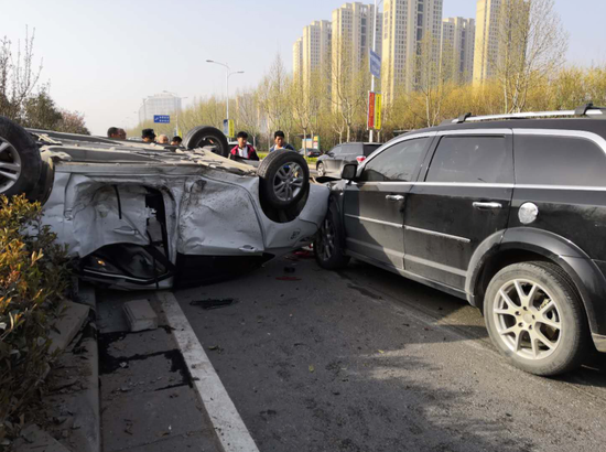 3月27日早上7時許,在鄭州市南四環與大學南路交叉口北約500米處,一輛白色轎車在路上拐彎時,被一輛直行的越野車撞上后,四輪朝天地翻進了路中間的隔離花壇里。事故發生后,轎車上的一名女乘客受傷被120急救車拉走,男司機也稱自己身體不適。