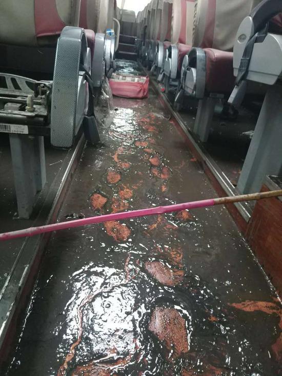 記者小心進入車內,只見過道上有不少污泥。該大巴車所在車隊的隊長介紹,被淹后,大巴車的發動機內進水,所有部件被淹五十多個小時,損失較大。