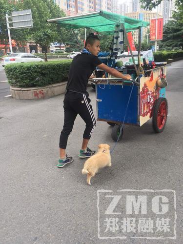 5月24日下午4時許,中原路與華山路口,一位青年男子推著自制鐵皮三輪手推車由東向西行走,車子上的一條細繩牽著一條小狗,過華山路口時他停了下來。