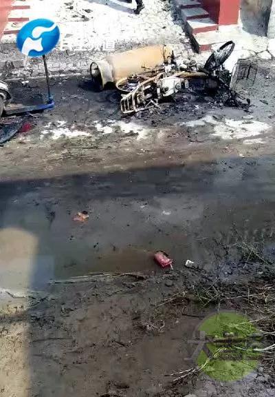 現(xiàn)場(chǎng)一輛汽車(chē)和一輛摩托車(chē)被燒成鐵架子↓↓↓