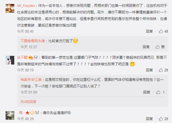 同時,還有網友表示,鄭州地鐵安檢和其他城市相比較而言,屬于非常嚴格的,甚至連礦泉水都要喝一口才能進站,所以這名質疑鄭州地鐵的網友,或許對于“氣球不能進地鐵站”的規定只理解了字面意思,卻不了解氫氣與二氧化碳的區別,不知者不怪,但無知就應該多學習,免得出門露怯。