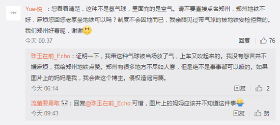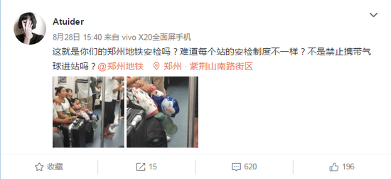 28日,網友@Atuider 發微博稱,“這就是你們的鄭州地鐵安檢嗎?難道每個站的安檢制度不一樣?不是禁止攜帶氣球進站嗎?”配圖顯示,在地鐵車廂內,一小女孩手里拿著藍色氣球。