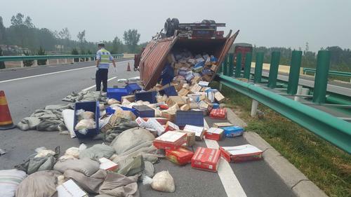當日11時許,安陽高速交警支隊二大隊接過路司機報警:范輝高速K82公里處有一輛廂式貨車翻車,貨物散落整個路面,影響通行。