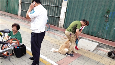 本報訊(記者 徐富盈 文/圖) 上周六清晨6點40分許,68歲的李老太晨練路過經七路原水產市場門口時,一條金毛犬撒著歡兒撲向她。金毛犬主人殷女士趕來拽走它,倒地的李老太右手握著左手,表情非常痛苦。“它撲上來,把我嚇壞了,我一屁股坐在地上,兩手下意識觸地,現在左手掌很疼”。
