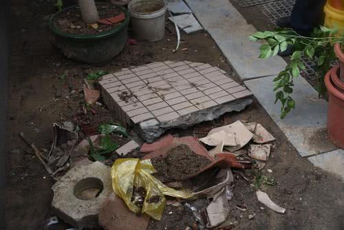 現(xiàn)場的居民告訴隊員,這些瓷片是中秋節(jié)晚上從26樓一住戶陽臺墜落的,順著居民所指的地方,看到26樓住戶陽臺的瓷磚脫落一半,剩下的一半也岌岌可危,隨時有掉下來的可能,擔(dān)心再出意外,隊員放置了警示牌。巡防隊員謝玉忠告訴記者,這塊水泥塊就是從26樓墜落的,兩人非常費勁才將其抬起,估計重量在一百斤左右。
