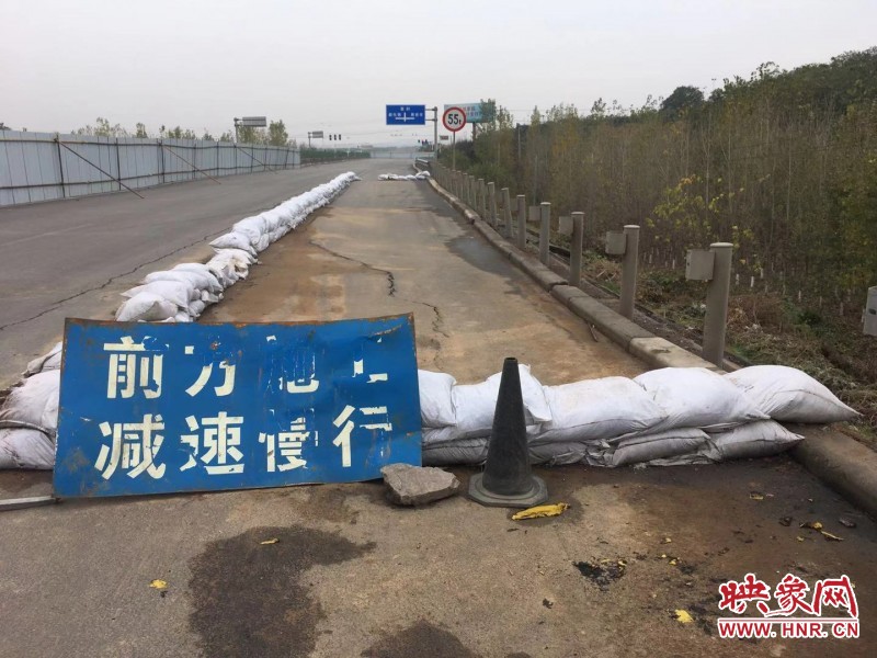 沿鄭登快速路從鄭州出發(fā),快到灣子河橋處,可以看到道路右半幅已經(jīng)被圍擋圍起來。圍擋上寫著“前方道路搶修,車輛靠左行駛”、“前方施工,過往車輛請繞行或慢待”的字樣。進(jìn)入圍擋內(nèi),可以看到灣子河橋處,路面有明顯下沉,不少地方出現(xiàn)裂縫,裂縫寬度能伸進(jìn)去成年人的手指。施工人員已經(jīng)用沙袋將出現(xiàn)裂縫和沉陷的區(qū)域圍了起來,橋邊的護(hù)欄正準(zhǔn)備拆除。
