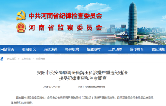 據(jù)安陽市紀(jì)委監(jiān)察委消息:安陽市公安局原調(diào)研員魏玉科(正處級(jí))涉嫌嚴(yán)重違紀(jì)違法,目前正接受安陽市紀(jì)委監(jiān)察委紀(jì)律審查和監(jiān)察調(diào)查。