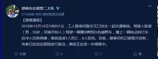 2018年12月14日10時01分,工人路淮河路交叉口發生一起交通事故。駕駛人陳某(男,59歲,河南開封人)駕駛一輛豫B牌照白色越野車,撞上一輛電動自行車后沖入沿街商鋪,事故造成1人死亡,8人受傷。目前,肇事司機已被警方控制,傷者已經送往醫院進行救治,事故正在進一步調查中。