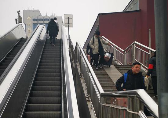 2月21日下午,記者來到鄭州火車站東廣場進行實地走訪,發現廣場外的14部上下天橋電梯,僅有位于大同路一側的2部可以正常運轉,其余都處于“罷工狀態”,成為擺設。因為時值春節后外出或者學生返校的高峰期,記者隨處可見拿著大箱小包的人們,上下天橋賣力地進行搬運。