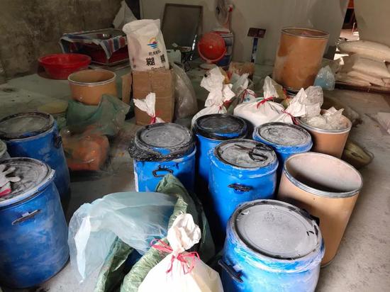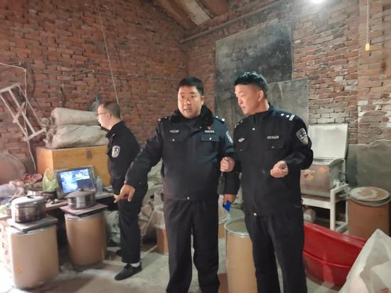 在袁局長的指揮下,民警翻墻入院,進到院里當(dāng)場控制違法犯罪嫌疑人2人,查獲生產(chǎn)設(shè)備壓片機1臺,粉碎機1臺,攪拌機1臺,拋光機1臺,烘干機1臺。查獲假冒偽劣性保健藥片15萬粒,酒精130公斤、糊精91.5公斤、食用玉米淀粉143公斤、羧甲淀粉鈉81.5公斤、白糖45.9公斤、疑似西地那非的藍色桶裝白色粉末108公斤、半成品粉末234.1公斤。