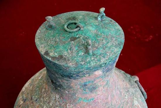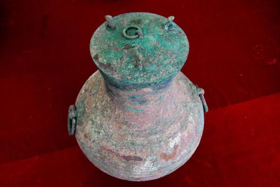 這是洛陽發現的西漢大墓出土的盛有液體的青銅壺(2018年11月7日攝)。新華社記者 李安 攝