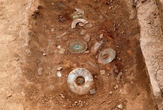 這是河南洛陽西漢空心磚券大墓棺內的陪葬器物(2018年11月7日攝)新華社記者 李安 攝