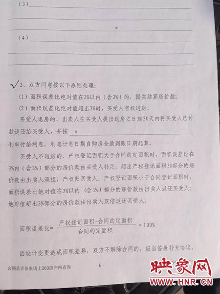 映象網訊(記者 邱延波 文/圖) 買的房子實際面積比合同面積大,按說遇到這事應該高興才對,然而,鄭州市惠濟區天河路上錦藝四季城的多名業主卻很生氣。原因竟是,售樓部的工作人員告知他們去領房產證時,需要把超出部分面積的房款全額補足,一下子要再交16萬多元,業主們不樂意啦。因為當初簽訂合同時,合同條款明確說明著:如果多出來的面積超過總面積的3%,只能按總面積的3%收取多出面積的費用。而這幾名業主的房子實際面積均多出約10平方米,遠超總面積的3%。