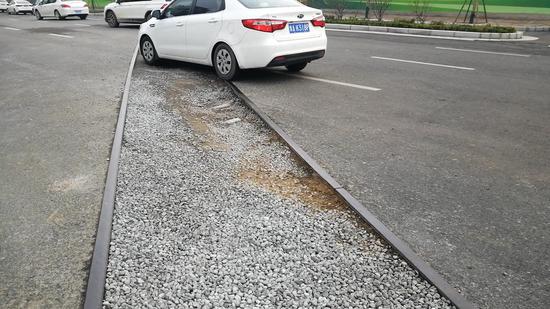 王先生告訴記者,這條路自己也經常走,因為路中間有條鐵軌,但是鐵軌并沒有被填平,每次開車路過的時候車子都會被“硌”一下。盡管已經非常小心了,但4月26日晚,自己的車胎還是直接被“硌”爆了。王先生去附近修理點修車時,修車小哥告訴他,最近晚上有很多車輛走到這里被爆胎。