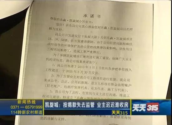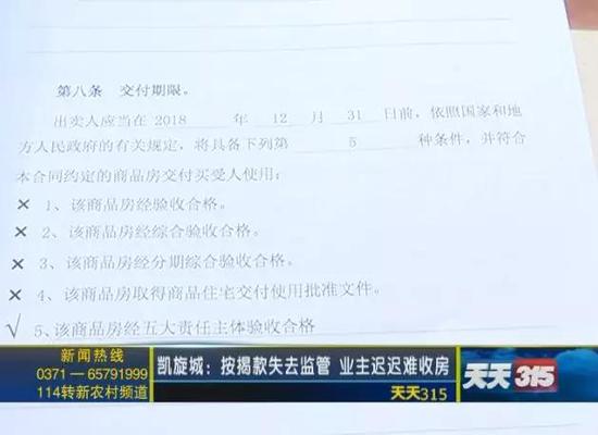 近日,新鄭市的常女士打來新聞熱線,說年她在新鄭市孟莊鎮的凱旋城購買了一處房屋,簽訂的購房合同是2018年的12月31號前交房,可是截止2019年的5月,凱旋城的開發商河南澤辰置業有限公司卻對業主們說沒錢了,不能再繼續施工。