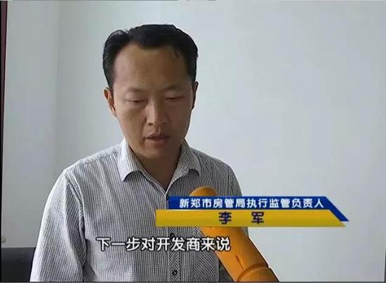 新鄭市房管局執行監管負責人李軍:下一步對開發商來說,我們作為房管部門,只能說督促治理,督促其盡快施工,給業主交房。對銀行來說,銀行是垂直管理部門,我們會通過各種途徑,向他們的管理行反映這些情況,首先要暫停三家違規銀行,在新政范圍內,再辦理新的監管業務,把這個業務給他停了。對業主來說,重要的是先拿到房,然后根據購房合同的約定,該誰承擔違約金就由誰來承擔。