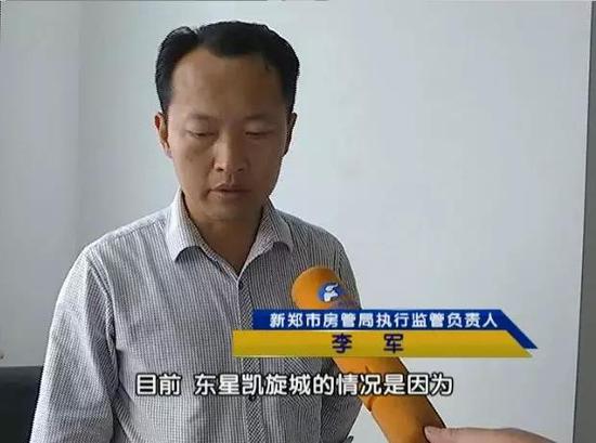 新鄭市房管局執行監管負責人 李軍:目前,東星凱旋城的情況是,資金鏈斷裂 。工程基本上處于停工狀態,造成這個主要原因,是因為有三家按揭行,沒有把按揭款,按照資金監管辦法的規定要求,及時轉入監管賬戶,致使大量的購房按揭款,失去監管。