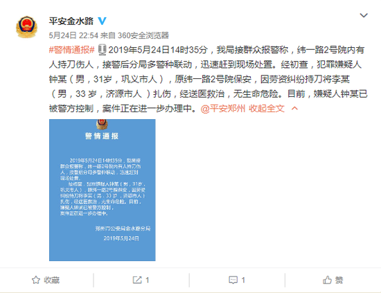 2019年5月24日14時35分,我局接群眾報警稱,緯一路2號院內有人持刀傷人,接警后分局多警種聯動,迅速趕到現場處置。經初查,犯罪嫌疑人鐘某(男,31歲,鞏義市人),原緯一路2號院保安,因勞資糾紛持刀將李某(男,33 歲,濟源市人 )扎傷,經送醫救治,無生命危險。目前,嫌疑人鐘某已被警方控制,案件正在進一步辦理中。