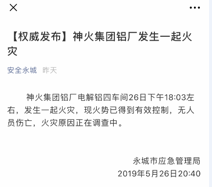 [權(quán)威發(fā)布]神火集團(tuán)鋁廠發(fā)生一起火災(zāi)