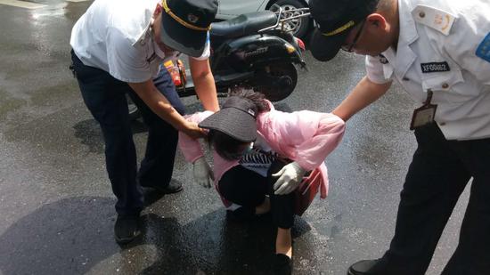 文化路街道巡防員呂師傅和隊友發現后,連忙跑上前將受傷女子從馬路上攙扶至安全地帶。