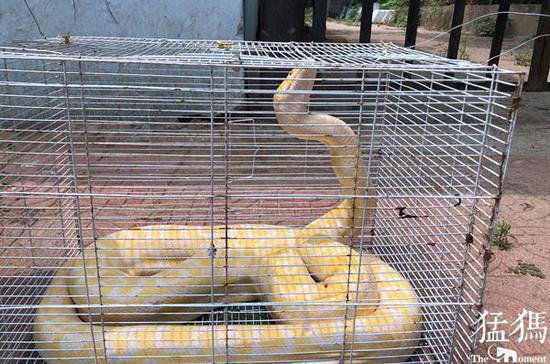 經(jīng)野生動(dòng)物救護(hù)站站長董朝偉辨認(rèn),該蟒蛇為緬甸黃金蟒,屬國家一級(jí)保護(hù)動(dòng)物,該黃金蟒沒有外傷,發(fā)育良好,體長接近4米,體重在15公斤左右。