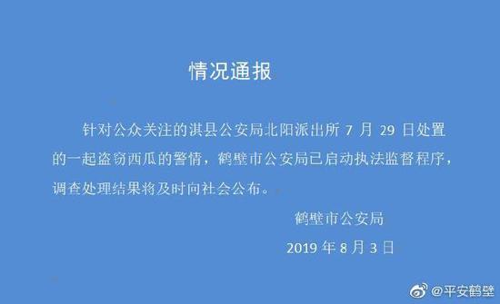 針對公眾關注的淇縣公安局北陽派出所7月29日處置的一起盜竊西瓜的警情,鶴壁市公安局已啟動執法監督程序,調查處理結果將及時向社會公布。(來源:平安鶴壁)