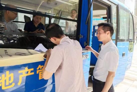 8月17日,記者來到市房管局,跟上整裝出發的一輛藍色“客車”。穿過大街小巷,一輛藍色中巴車車停在省人民醫院停車場,“劉哥”熟練地打開車門,伸展車窗,開啟車載電腦,一個“流動的服務大廳”瞬間展現在面前。原來,這不是客車,是大名鼎鼎的房管局便民服務車---“房管藍”。這時一個朝氣蓬勃的小伙子走過來,興奮地跟“劉哥”打招呼,“劉哥”招呼他上車,審資料、簽字、辦結三分鐘搞定,小伙不敢置信地謝過“劉哥”和現場工作人員,上樓繼續上班了。
