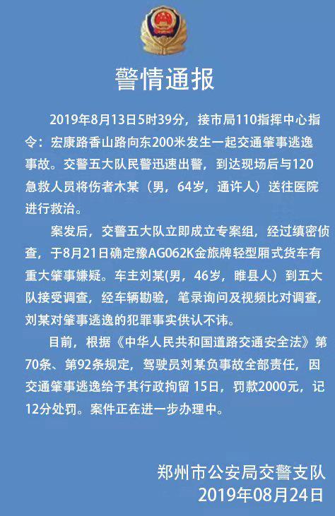 案發后,交警五大隊立即成立專案組,經過縝密偵查,于8月21日確定豫AG062K金旅牌輕型廂式貨車有重大肇事嫌疑。車主劉某(男,46歲,睢縣人)到五大隊接受調查,經車輛勘驗,筆錄詢問及視頻比對調查,劉某對肇事逃逸的犯罪事實供認不諱。