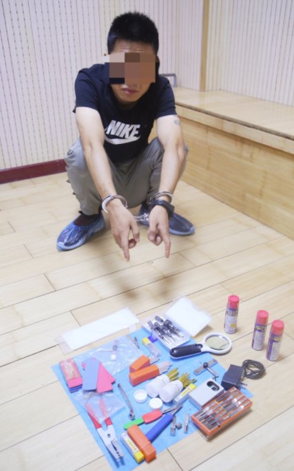 民警將線索反饋至新密市公安局合成作戰指揮中心,調取案發小區附近路面監控順線追蹤,監控畫面顯示,黑衣男子盜竊得手后步行沿北密新路拐到東大街,到某賓館門前駕駛一輛白色寶馬轎車離開,車牌號為豫L6**75。隨即,民警對嫌疑車輛的行車軌跡展開調查,一路追蹤到漯河市。19日下午,刑偵一中隊指導員王子龍帶領偵查員崔士杰、陳柯汀趕至漯河實施抓捕。在當地警方的配合下,民警對嫌疑車輛消失地周邊進行摸排、蹲守,當晚23時許,嫌疑男子準備駕車離開時,被民警抓獲,當場從車內搜出插片、錫紙、十字鎖強開工具、鉗子等開鎖用的作案工具100余件和被盜金銀首飾若干。