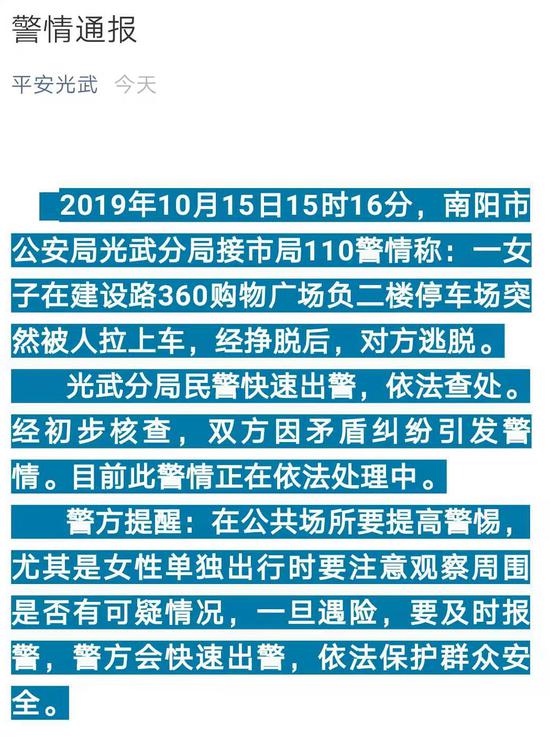 16日晚,大象新聞記者從南陽市公安局獲悉,10月15日15時16分,南陽市公安局光武分局接市局110警情稱:一女子在建設路360購物廣場負二樓停車場突然被人拉上車,經掙脫后,對方逃脫。